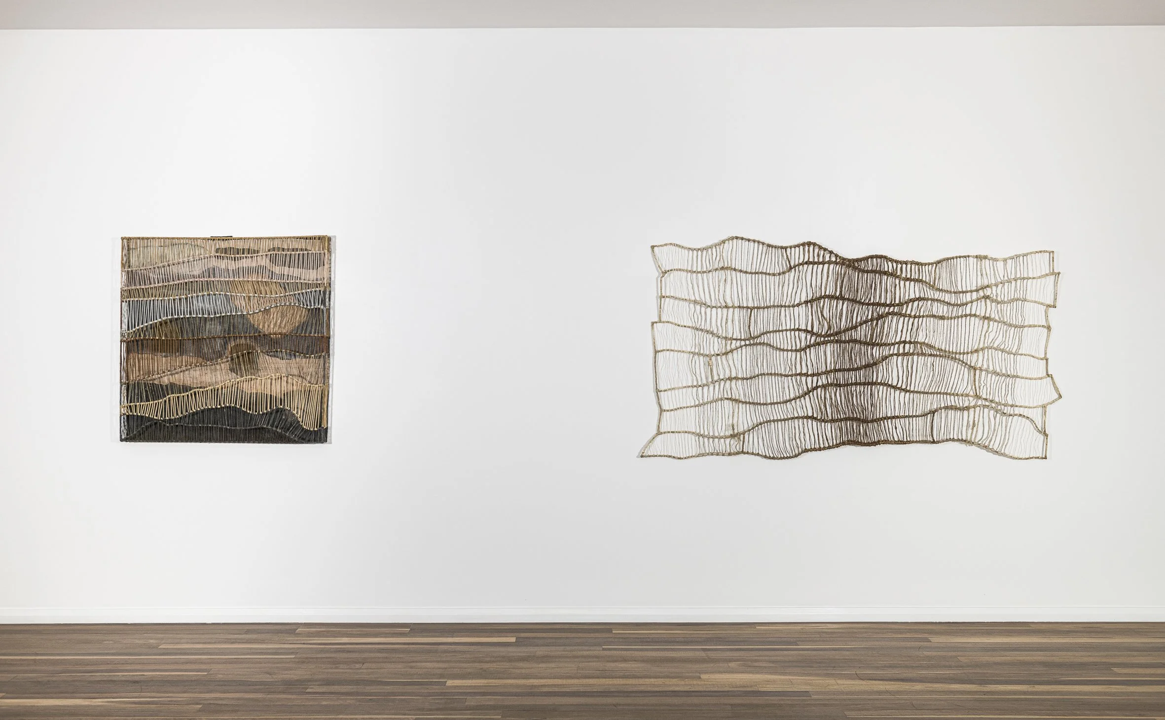 Harriet Goodall, My Fault Lines, 2024, Muslin, Abaca, Linen, Jute, Paper, Waxed cotton, Coconut Fibre, Seagrass, Steel, Water-based Acrylic, Ground Earth Pigments, 110 x 200cm