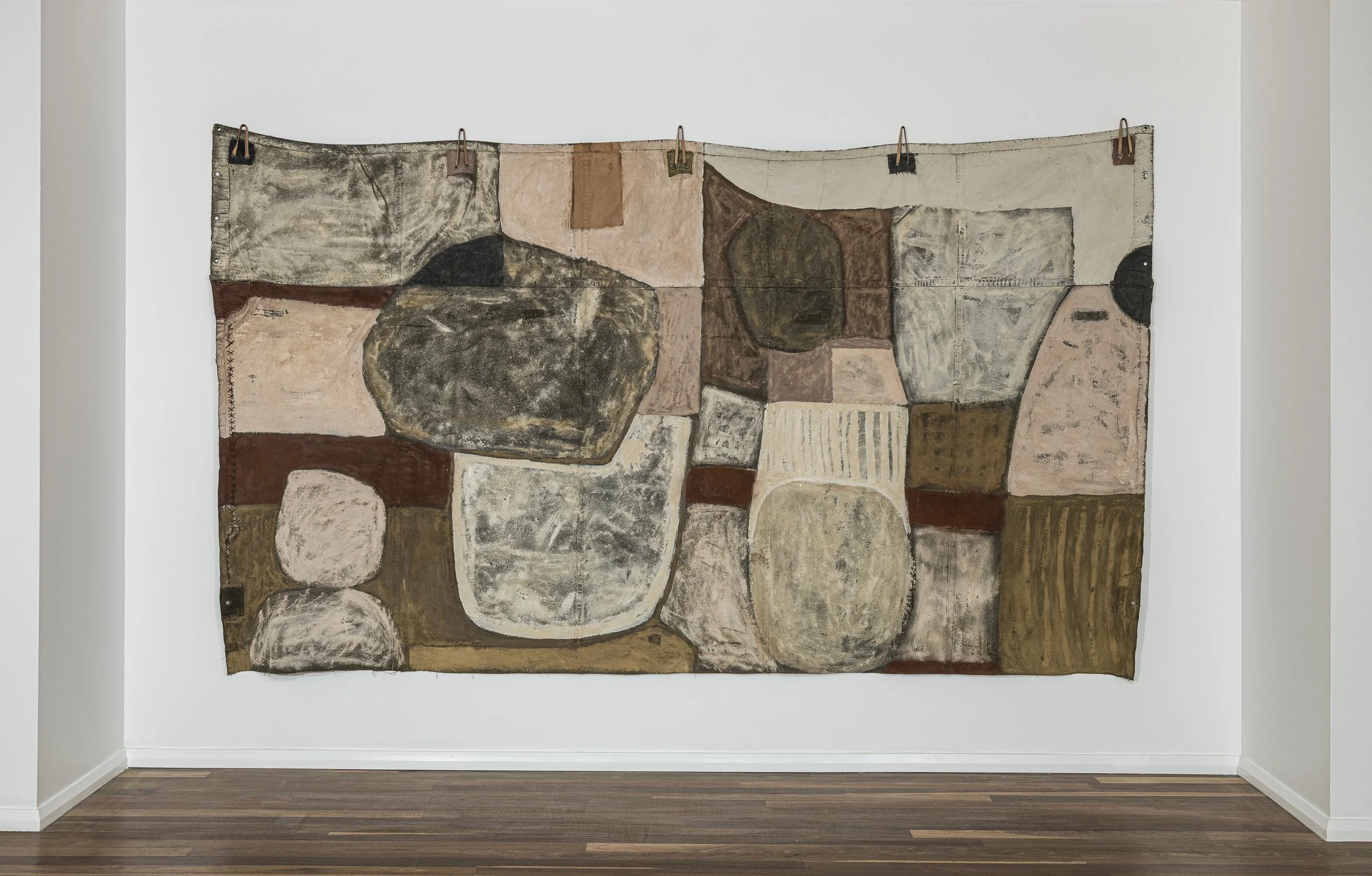 Harriet Goodall, Even Boulders End Up In the Hourglass, 2024, Semi-Trailer Tarpaulin, Waxed Linen Thread, Water-based Acrylic, Ground Earth Pigments, 205 x 355cm