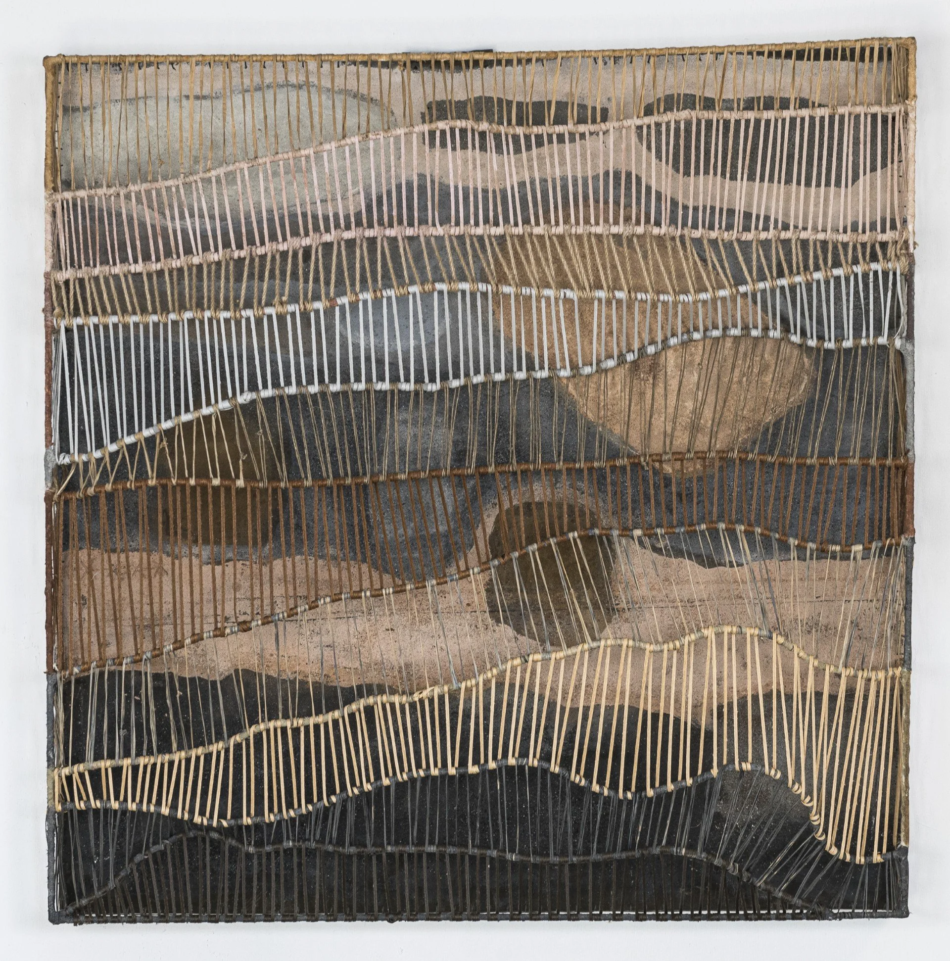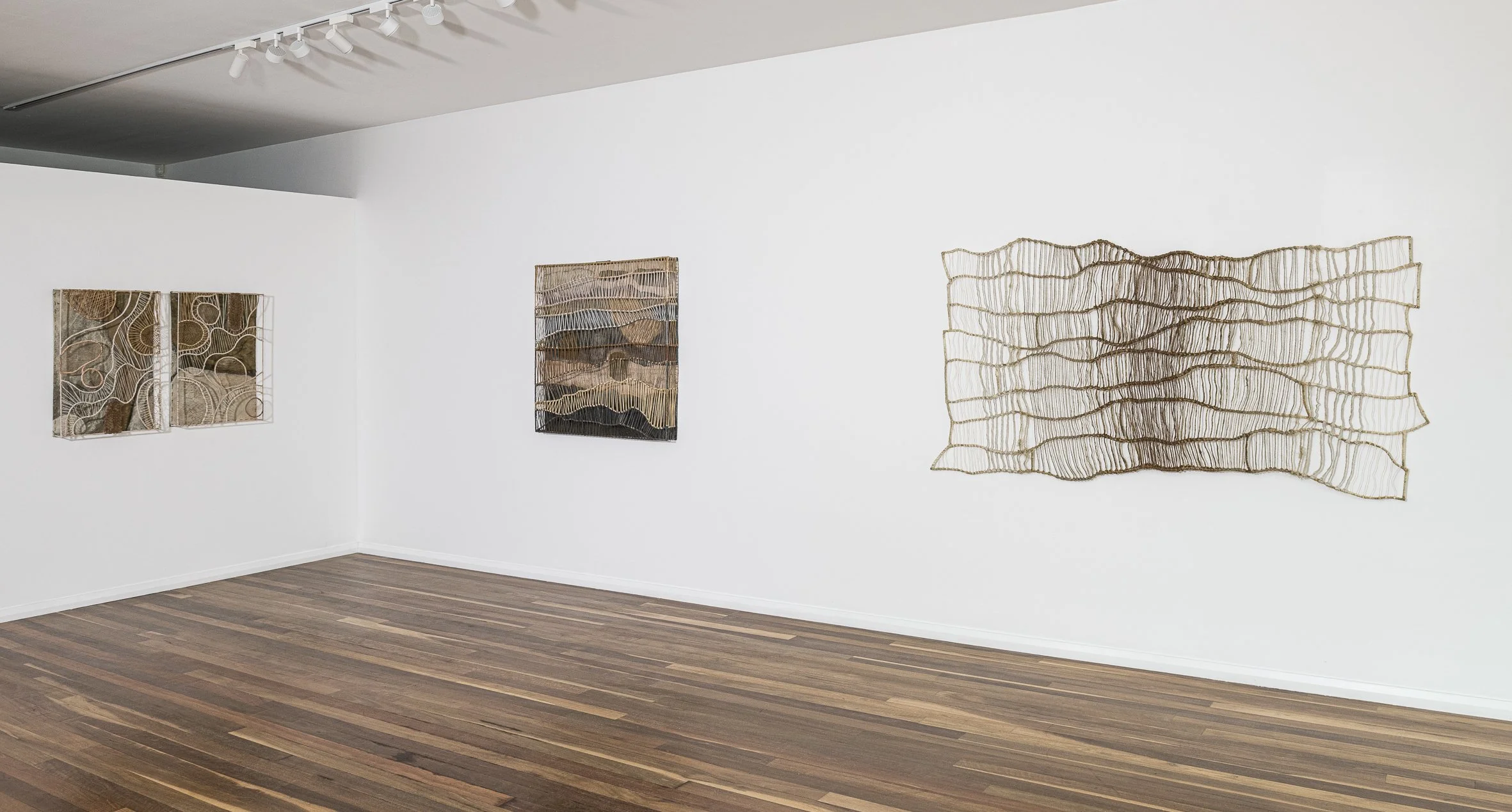 Meditative, tactile practices of weaving, stitching and encaustics are central to her work; she takes ancient global traditions and melds them using metalwork techniques like welding, brazing and riveting which she saw her father use on the farm. Harvesting plant materials, ochres, and earth pigments from the bush, salvaging agricultural off casts and recycled metal, she creates works with a focus on balance, patina and shadow that speak of a respect for the landscape of her youth.