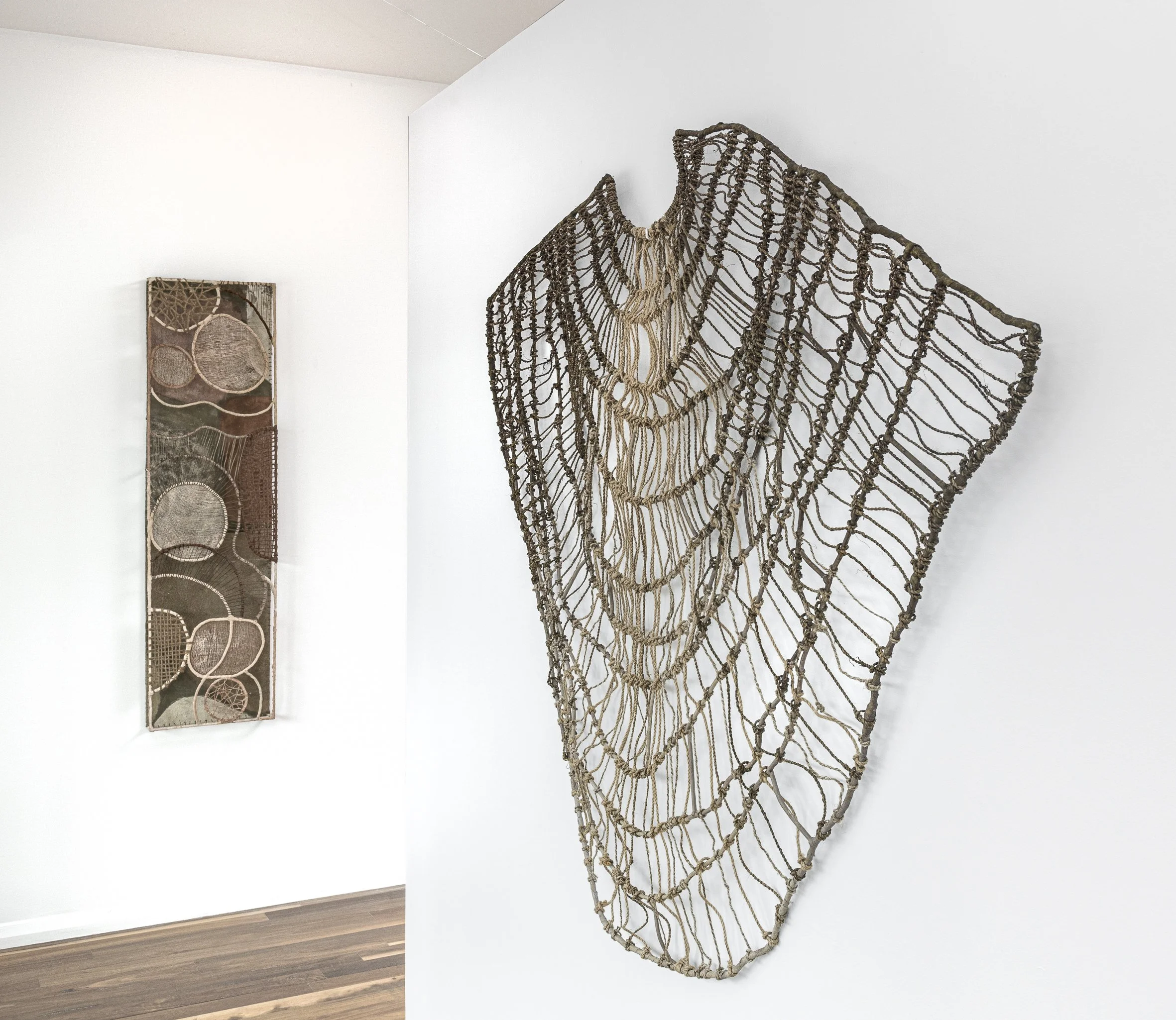 Harriet Goodall, Take Up The Mantle, 2024, Muslin, Seagrass, Linen, Hemp, Paper, Steel, Water-based Acrylic, Ground Earth Pigments , 165 x 130cm