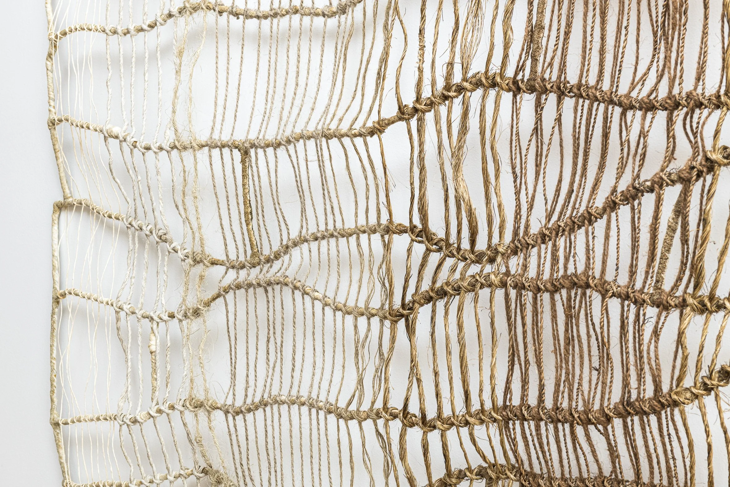 Harriet Goodall, Take Up The Mantle, 2024, Muslin, Seagrass, Linen, Hemp, Paper, Steel, Water-based Acrylic, Ground Earth Pigments , 165 x 130cm (Side view, detail)