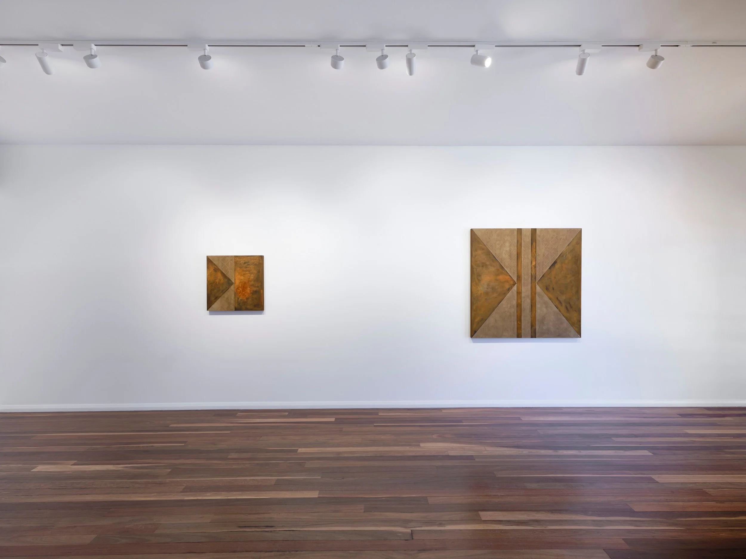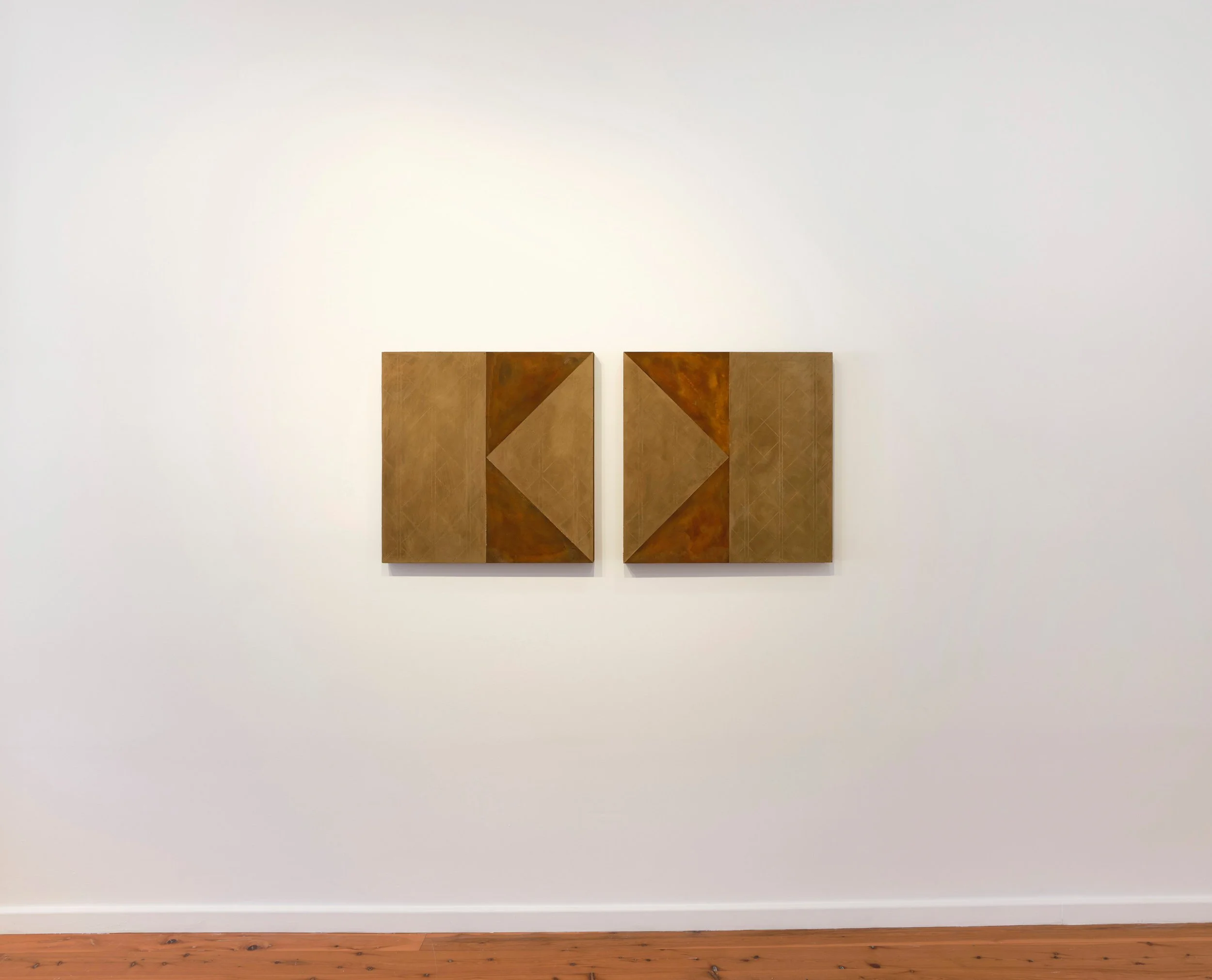 Jaz Corr, Brother 1/2, 2025, burnt incisions, rust, lime, hints of gold on wood panel, 60 x 60 cm
