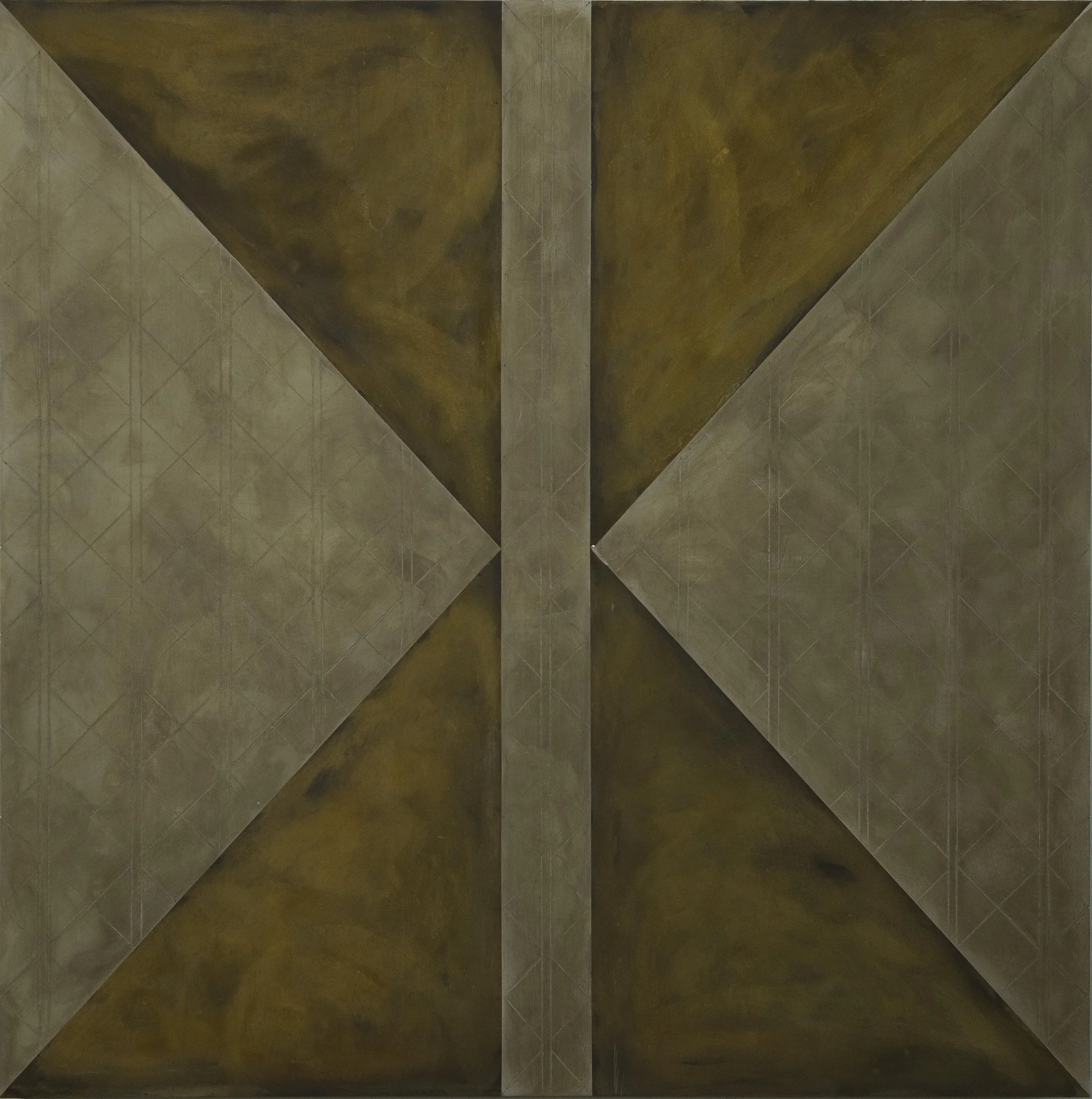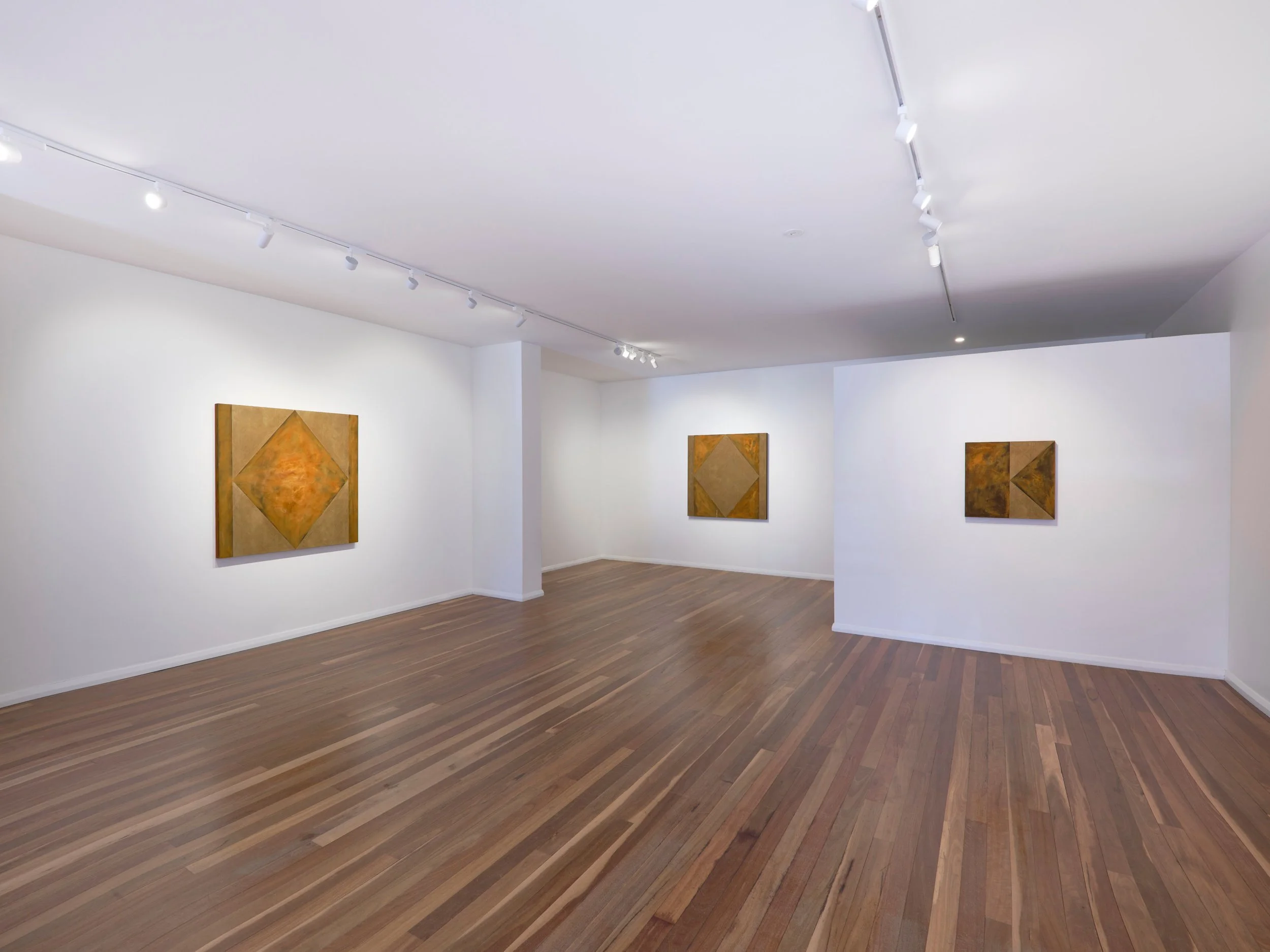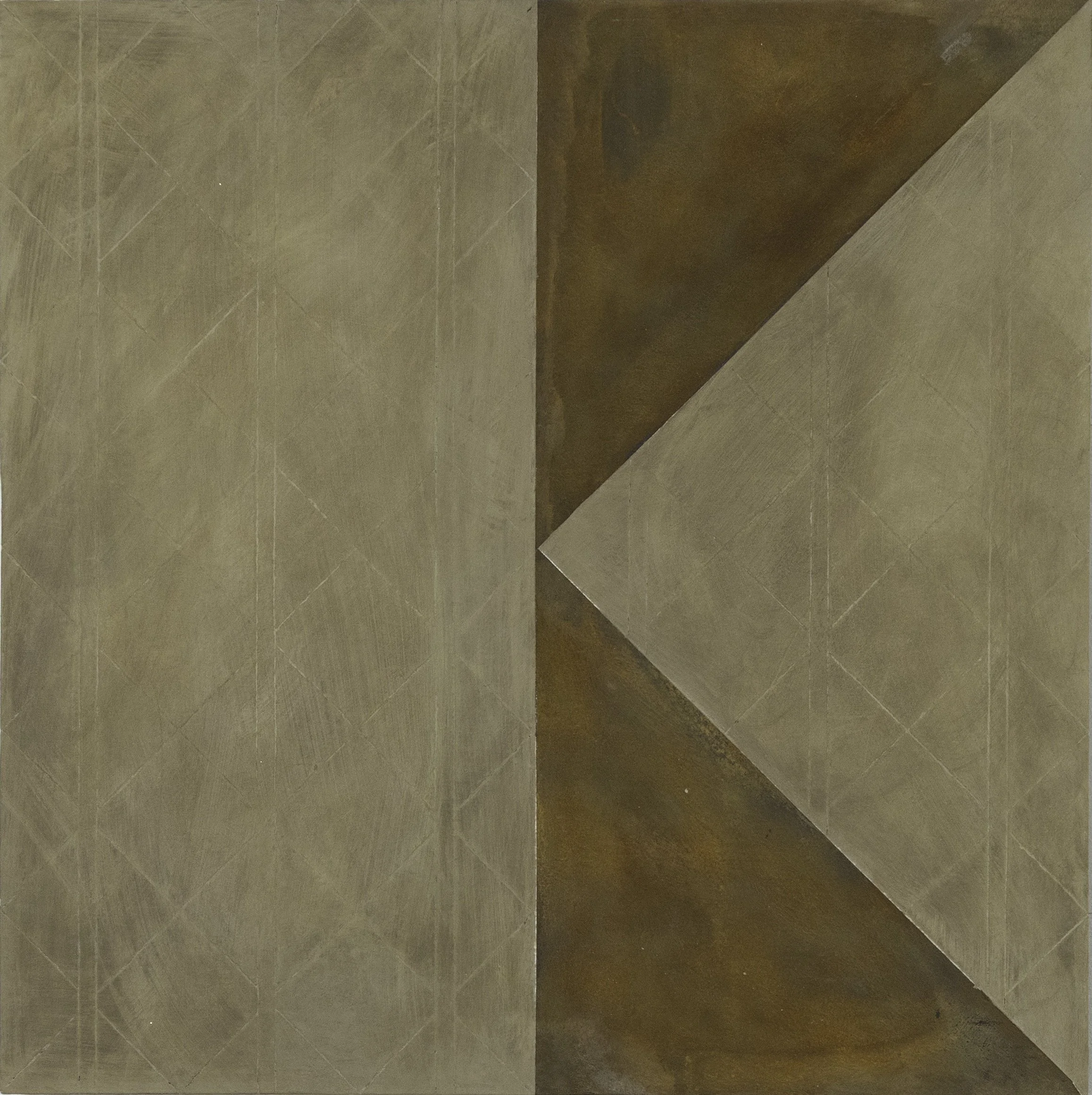 Jaz Corr, Uncle 1/2, 2025, burnt incisions, rust, lime, hints of gold on wood panel, 60 x 60 cm