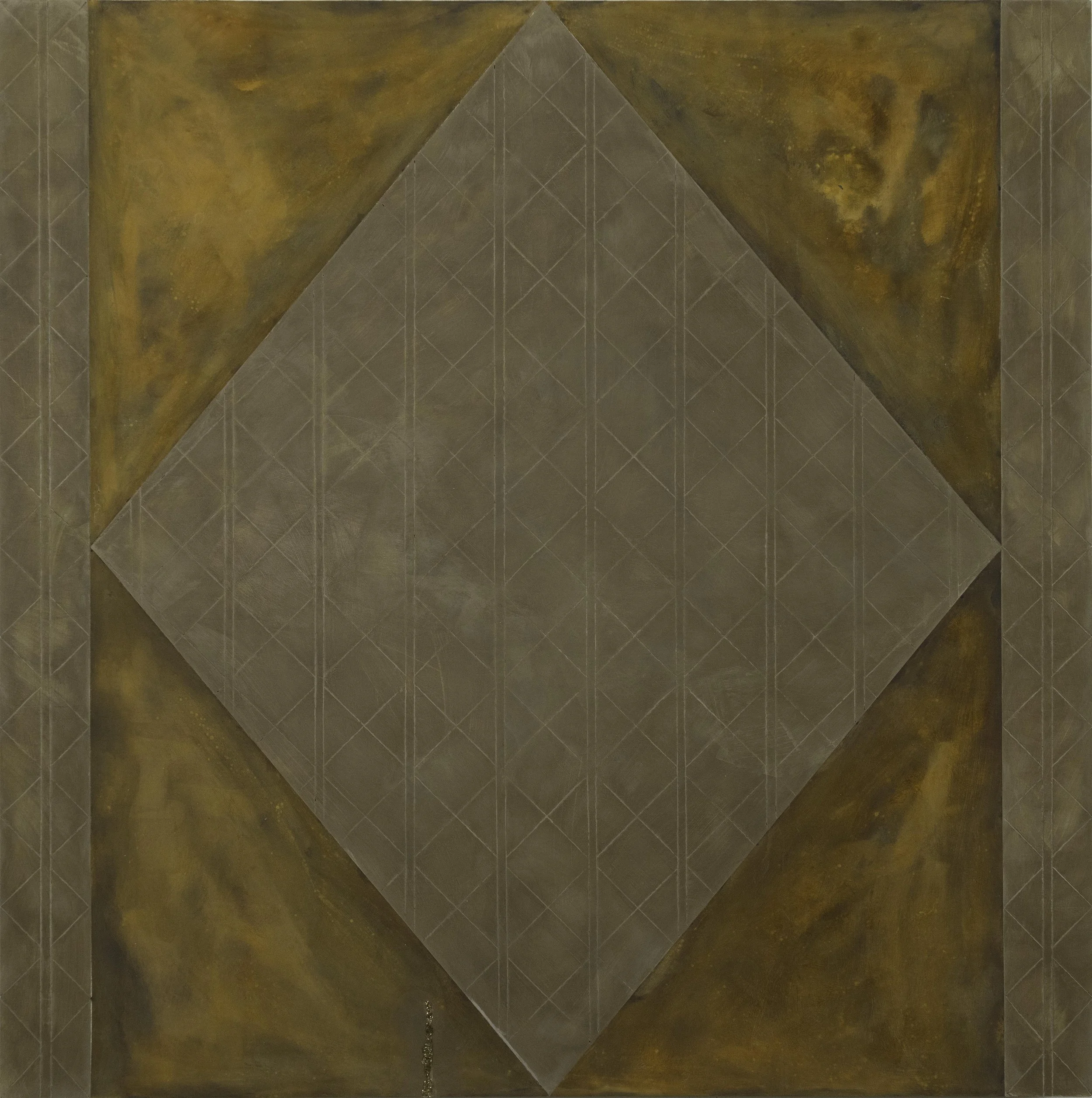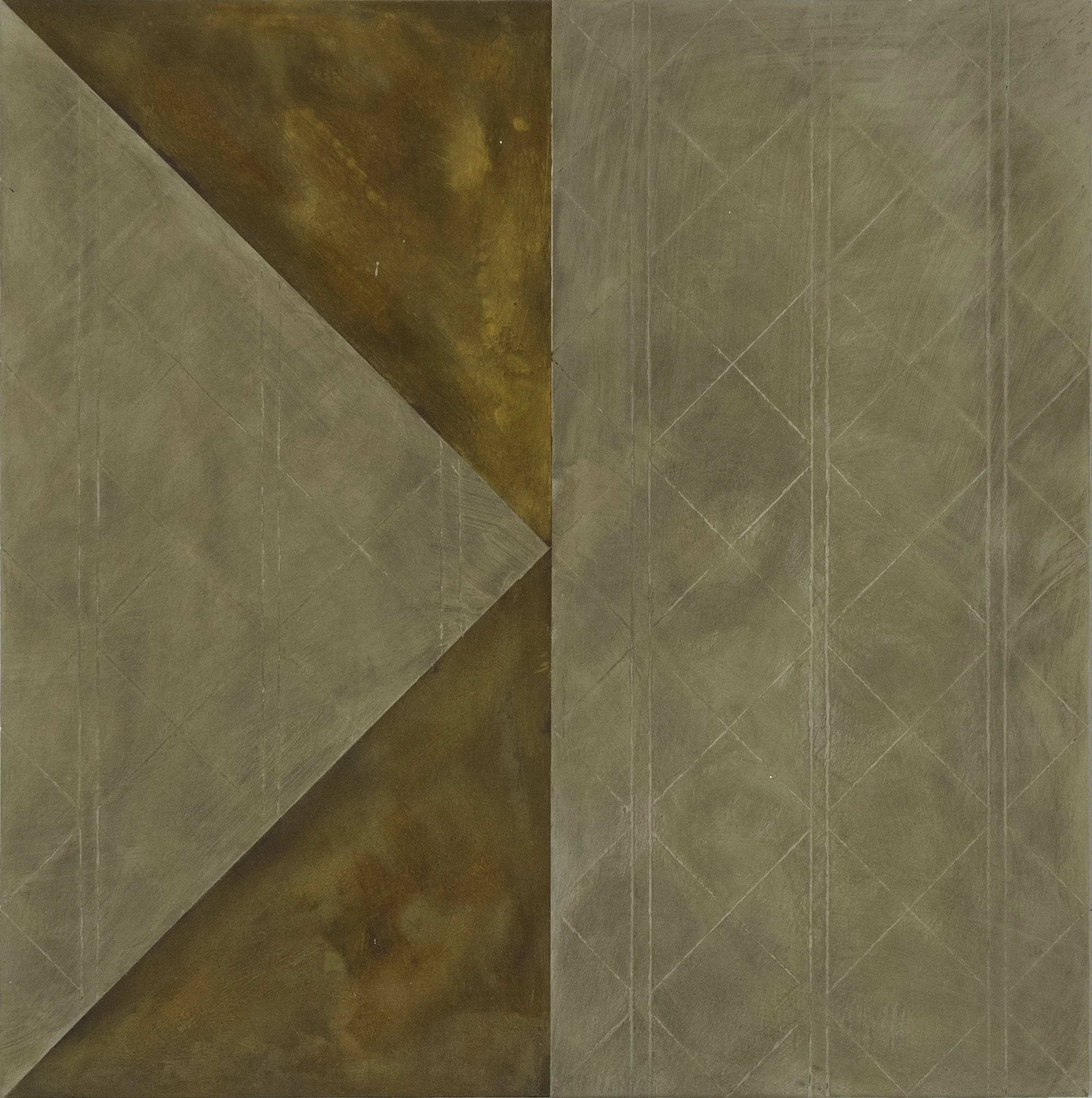Jaz Corr, Uncle 2/2, 2025, burnt incisions, rust, lime, hints of gold on wood panel, 60 x 60 cm