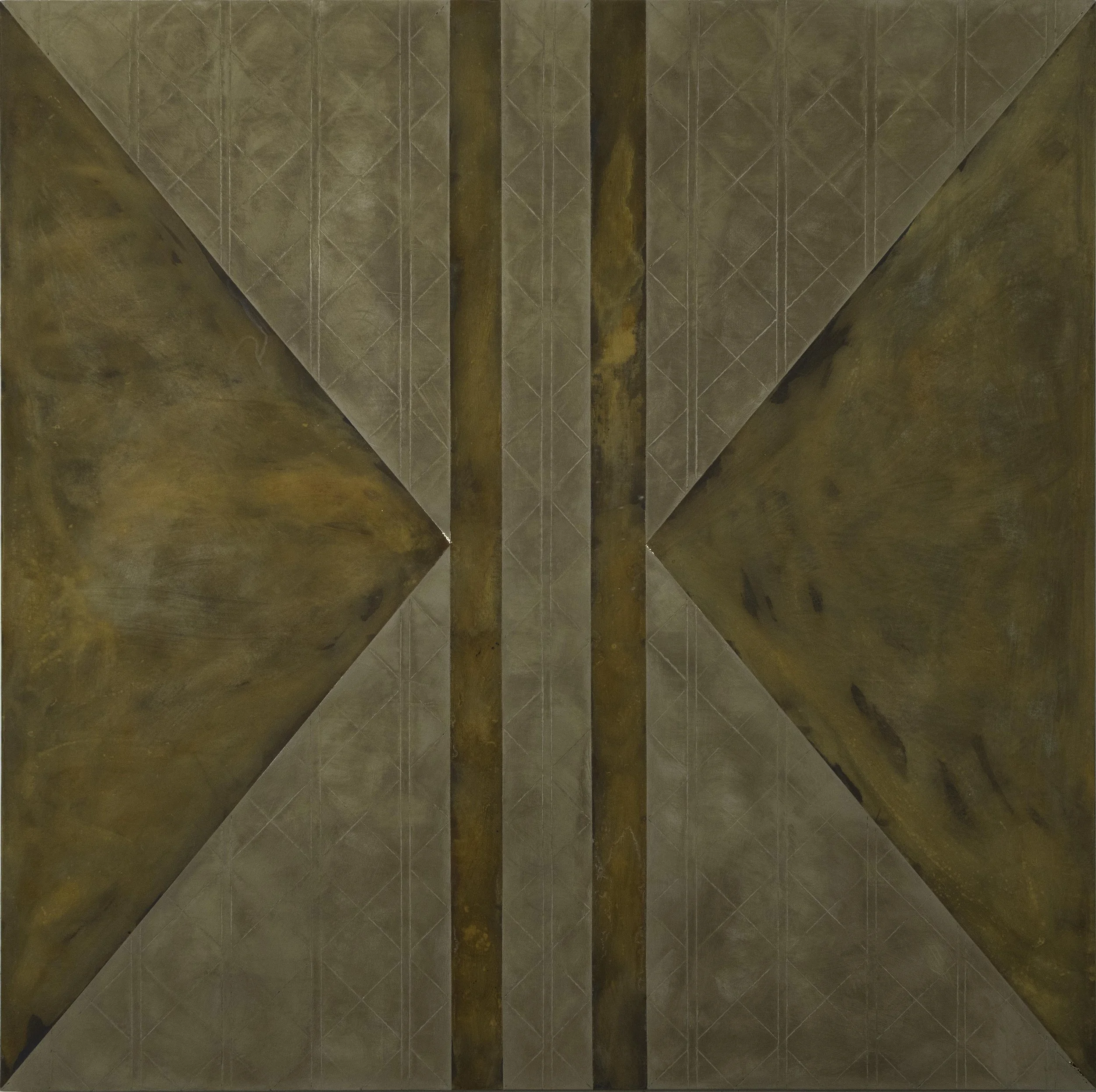 Jaz Corr, Brother 2/2, 2025, burnt incisions, rust, lime, hints of gold on wood panel, 60 x 60 cm