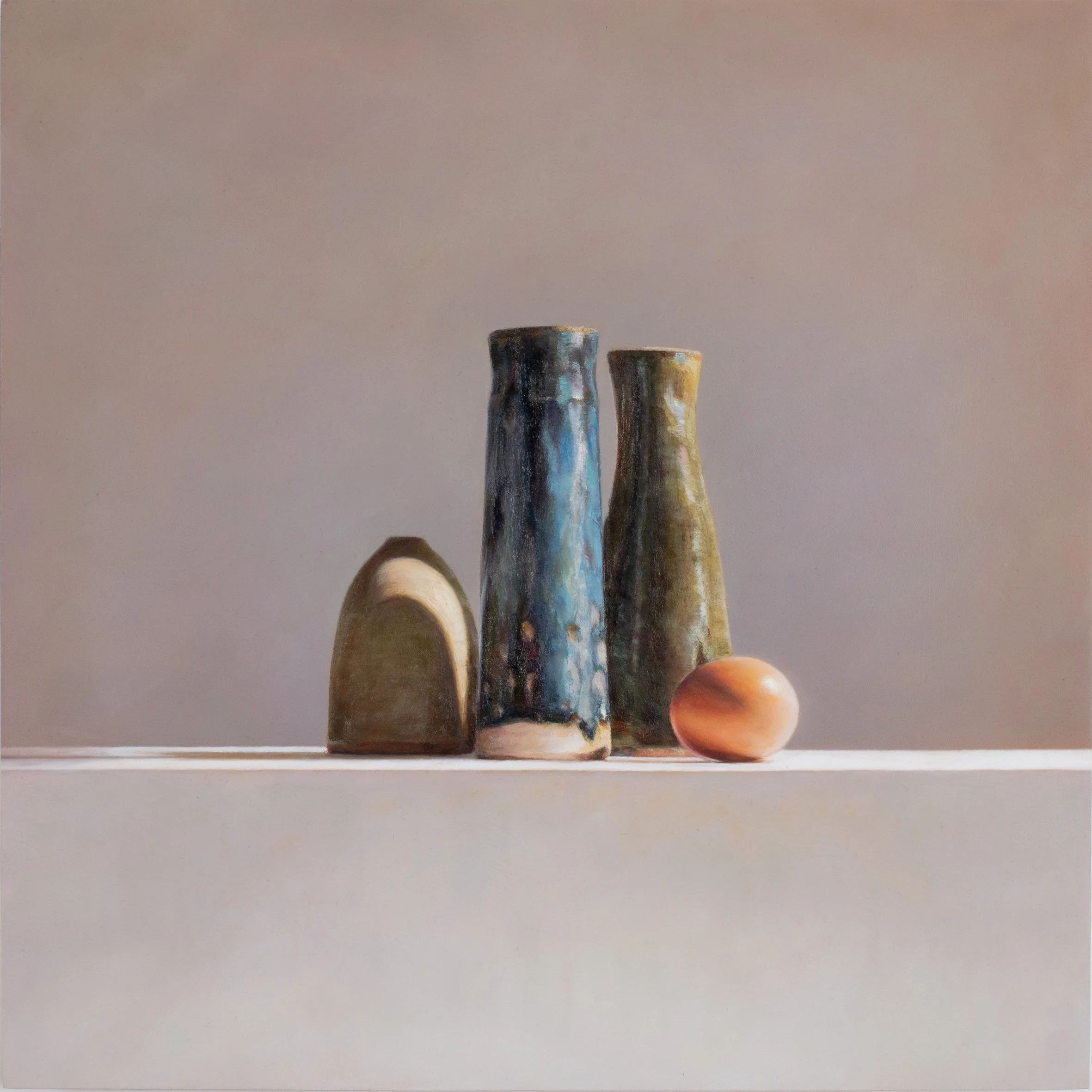 In 2024 we watched from our home as a bushfire took hold of the headland across the harbour, the orange glow of the flames moving across the peninsula in the cool evening twilight. A few weeks later, I collected ash from the site and began experimenting with it to make glazes. Neighbours gave me clay they had dug up from their block when they were burying roadkill. These are the local materials I use to make the ceramics in these paintings; local clay in the vessels and the ash in their glazes, and all are fired in the flames of a gas kiln. The pots stand as still life landscapes, existing as sculptural installations and in paintings, some accompanied by cuttings of endemic plants, inviting us to consider their materiality and, consequently, the inherent qualities of the Kinjarling landscape contained within them.