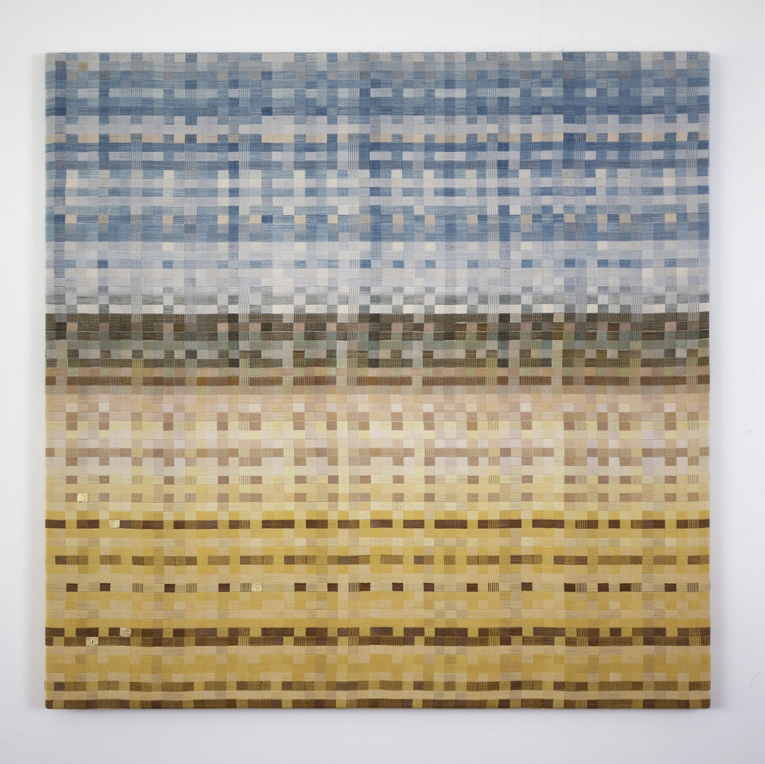 Hannah Cooper, Heidelberg pastoral redux (hashtag canolafields), 2023, handwoven naturally-dyed mulberry silk, gold leaf, 103 x 103 cm (framed)