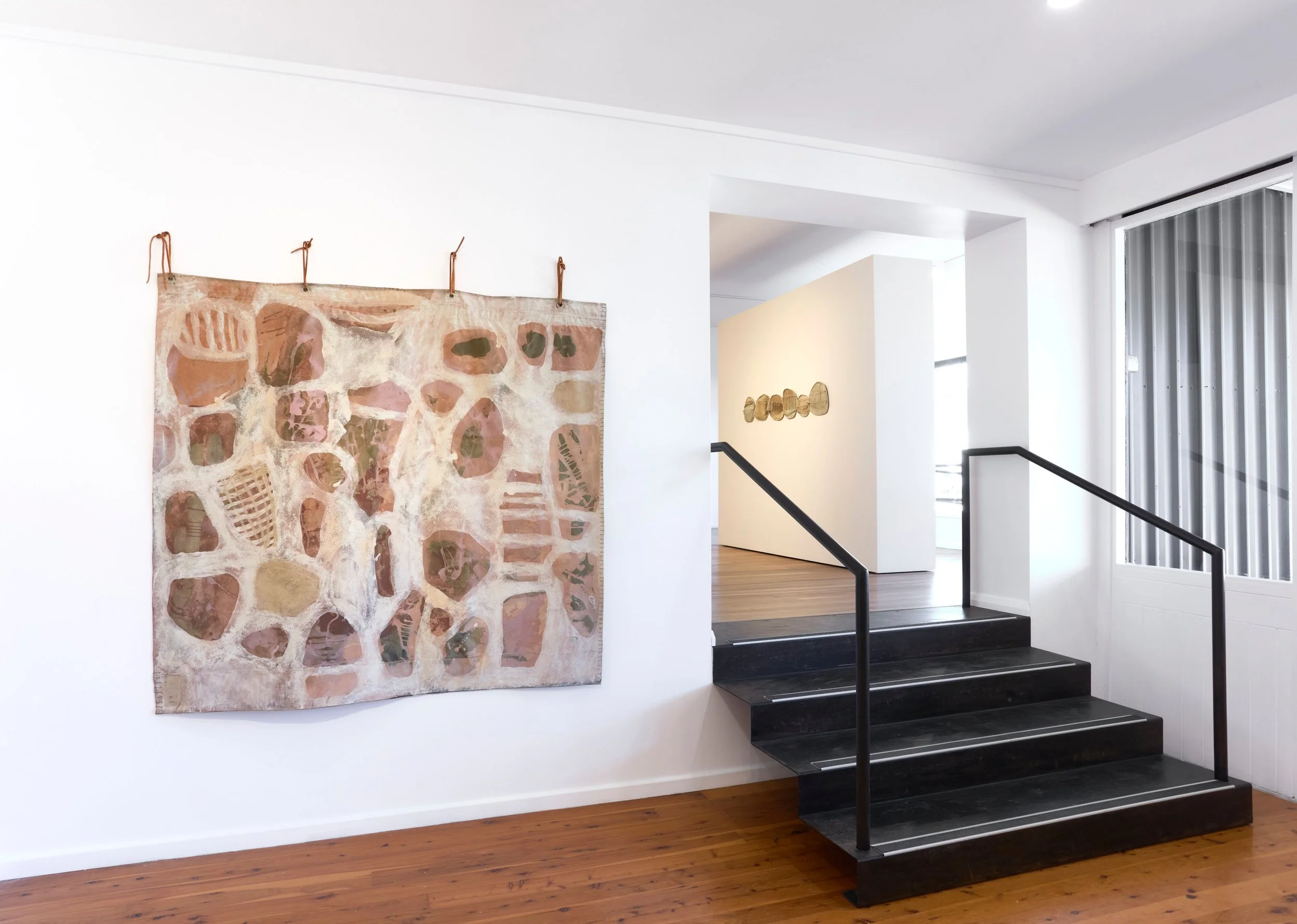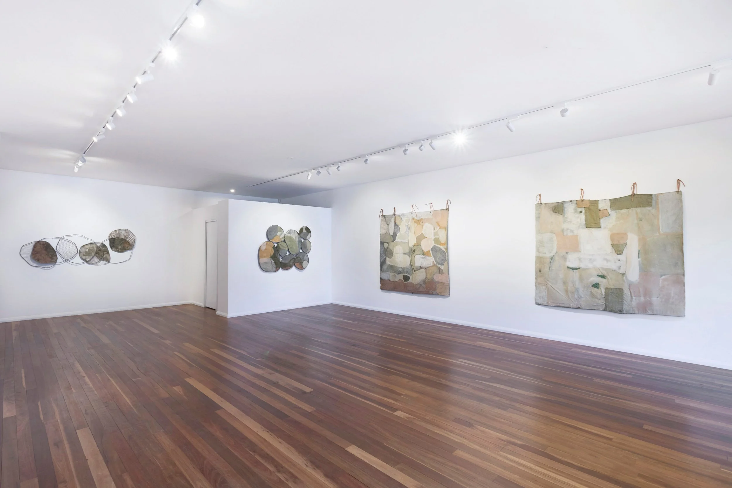 Harriet Goodall, Floating Over Clay Pans, 2023, mild steel, ground earth mineral pigment, clay, sand, soil, silk, paper, linen, raffia, wax, binder, sealer,, 79 x 115 x 9cm (d) (diptych)