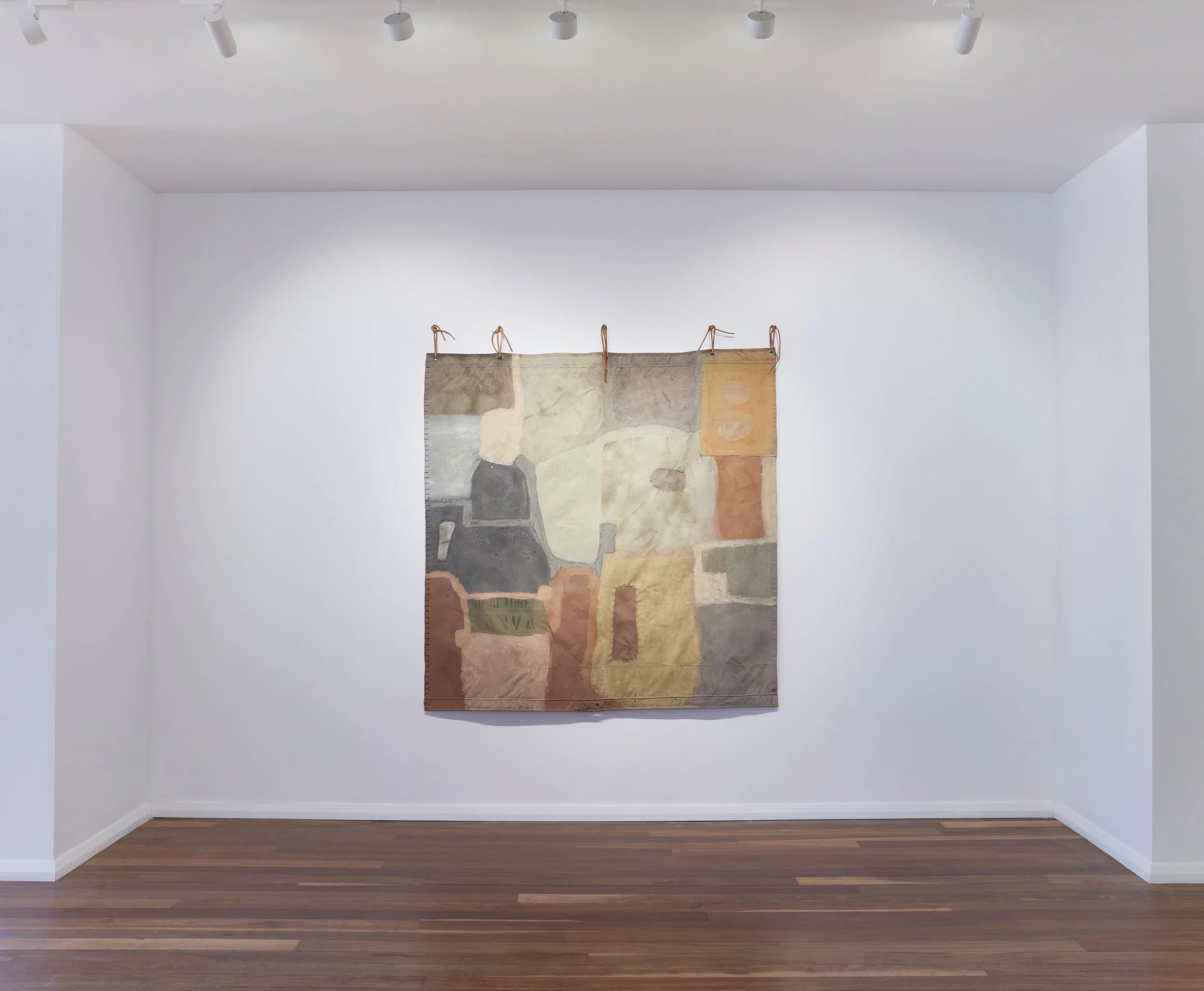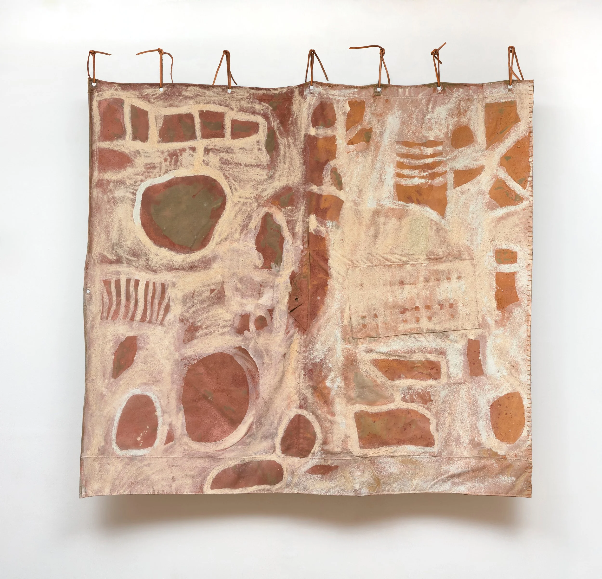 Harriet Goodall, Above Zebedee, 2025, semi-trailer tarpaulin, ground earth pigments, water-based acrylic, linen thread, leather, 171 x 175 cm