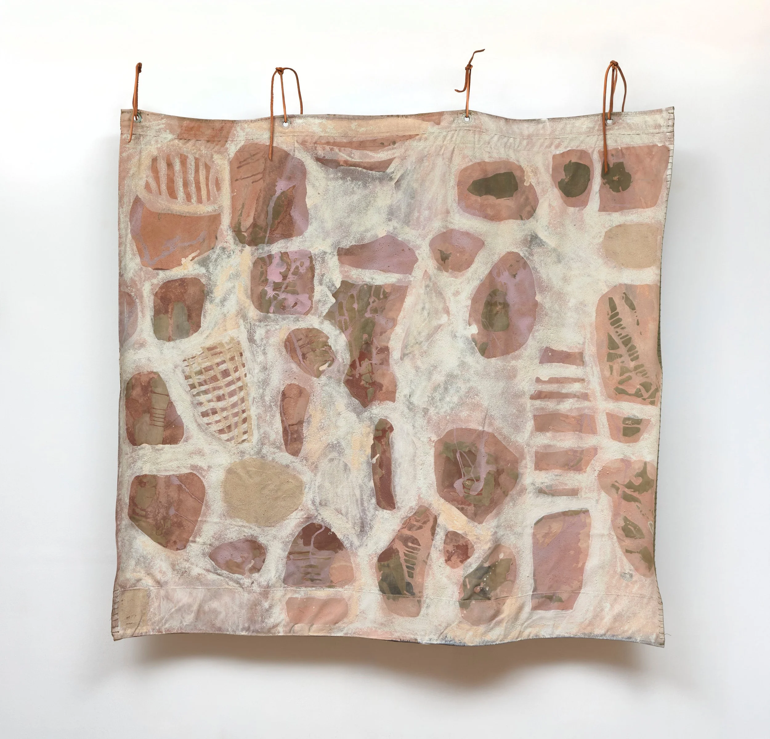 Harriet Goodall, Proliferation / Sand, 2025, semi-trailer tarpaulin, silk, linen thread, paper, steel, ground earth pigments, water-based acrylic, 105 x 135 cm