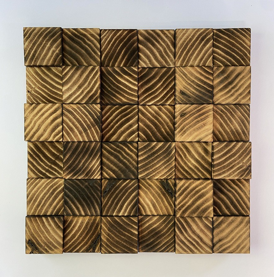Birte Larsen, End Grain , 2025, Charred pine on birch ply, 39 x 39 x 3.5cm