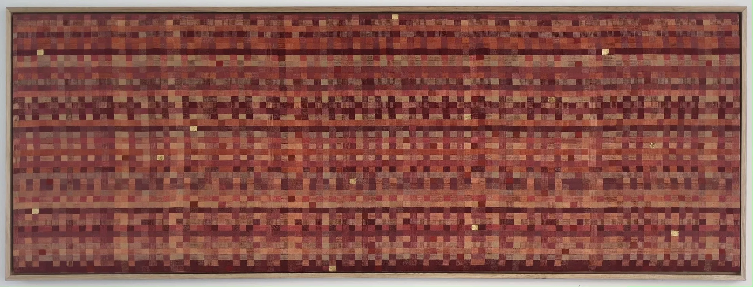 ‘An Impossible Shade of Red’, 2023, hand woven silk dyed with plants (eucalyptus leaves, madder root, annatto seeds, sappan wood, cutch and black walnut husks) and insects (cochineal and lac) with gold leaf and acrylic squares, 65 x 175cm